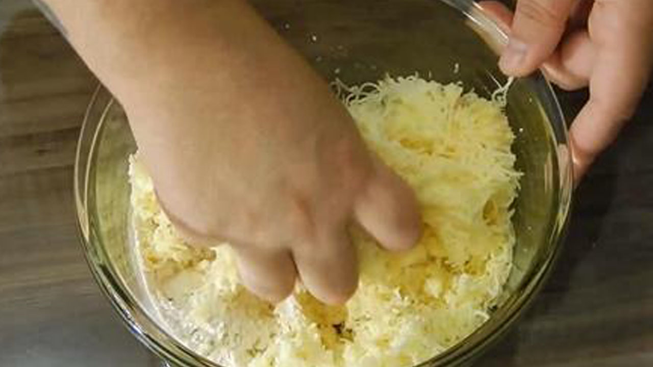 1. Смешай тертый твердый сыр или моцареллу, яйцо и пармезан.
