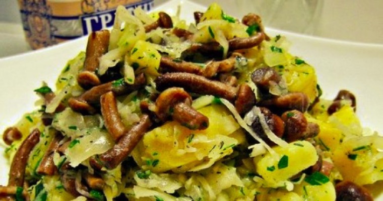 300 грамм мелко нарезанных шампиньонов пожарить на сковородке, смешать с 500 граммами отварного картофеля, двумя солеными огурцами и 200 граммами квашеной капусты. Добавить сметану, соль и зеленый лук по вкусу. Украсить репчатым луком, нарезанным кольцами.