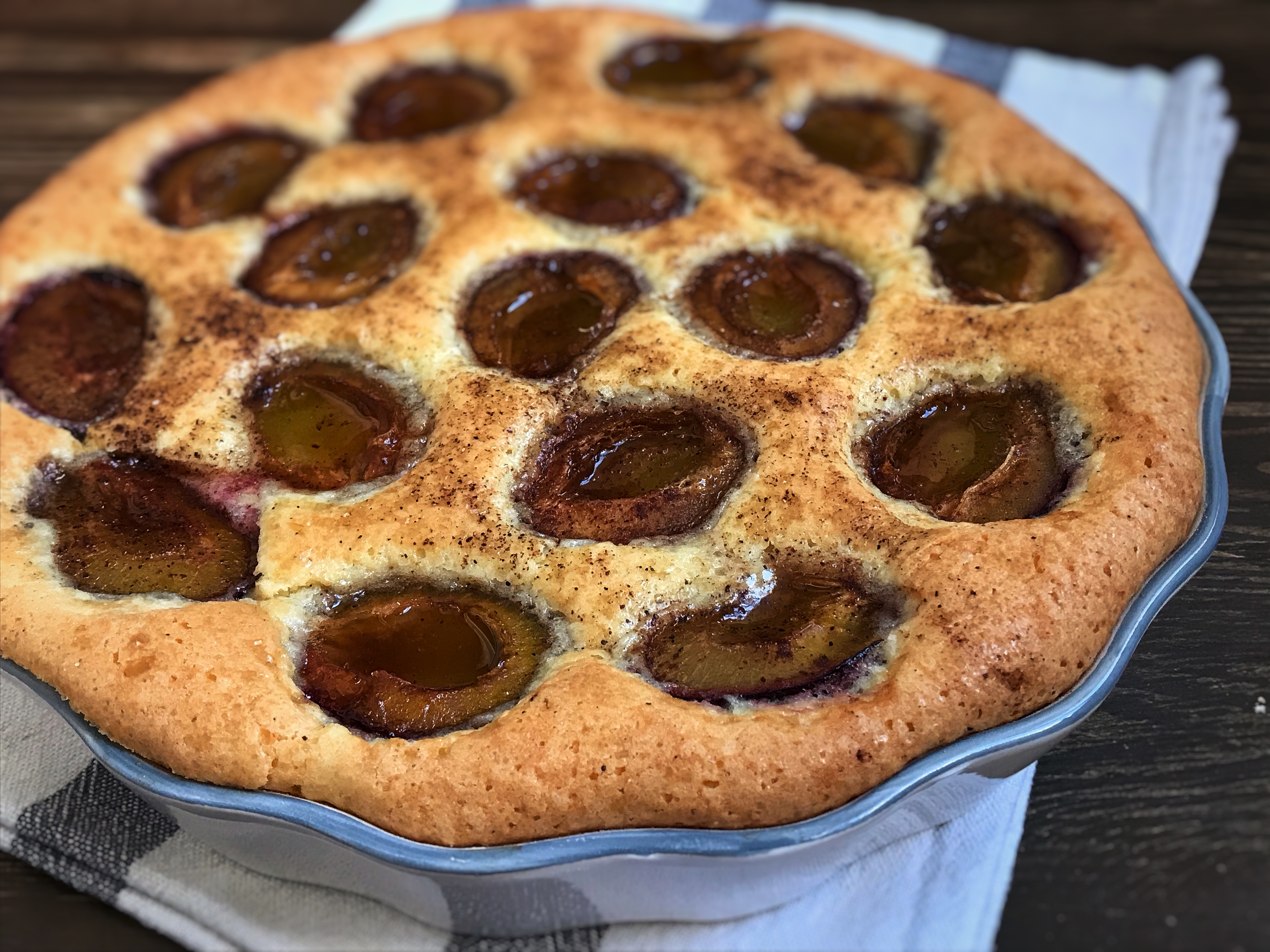 У меня форма размером 19*23 см, сливы я размещаю в 3 ряда. Дори рекомендует форму 20*20 и сливы размещать в 4 ряда.