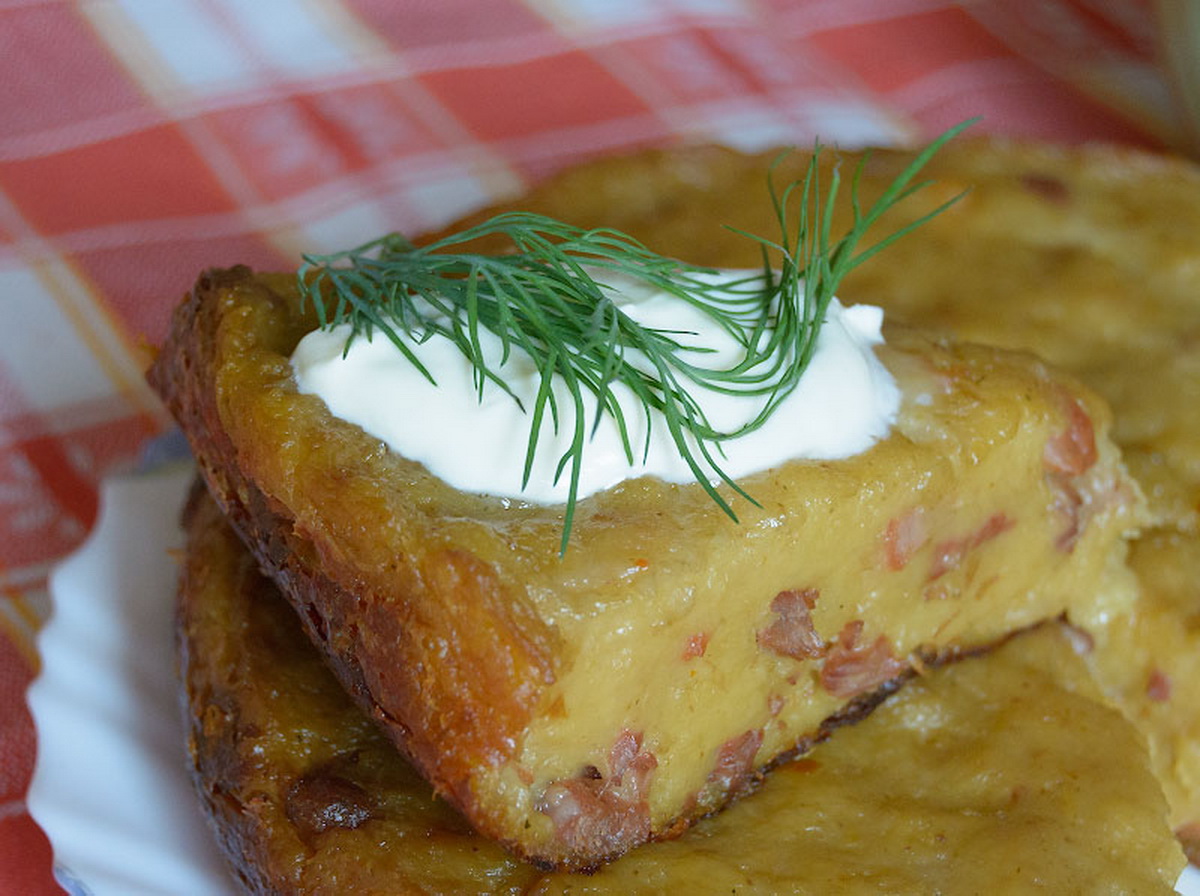 Бабка в духовке представляет собой пикантное запеченное блюдо из тертого картофеля, приправленное золотыми кусочками копченого бекона и жареным луком. В этот гарнир можно добавлять специи или травы, которые оттеняют вкус картофеля и сделают его более выразительным. Подавать готовое блюдо рекомендуем со сметанным или грибным соусом.