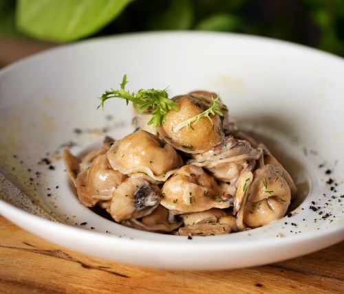 Жареные пельмени с грибами помещаю в порционные горшки или сотейник, добавляю горячий бульон, лавровый лист и сметану, перемешиваю и ставлю в разогретую духовку. Бульон предпочитаю брать куриный. Можно приготовить его из кубика или взять просто горячую воду.