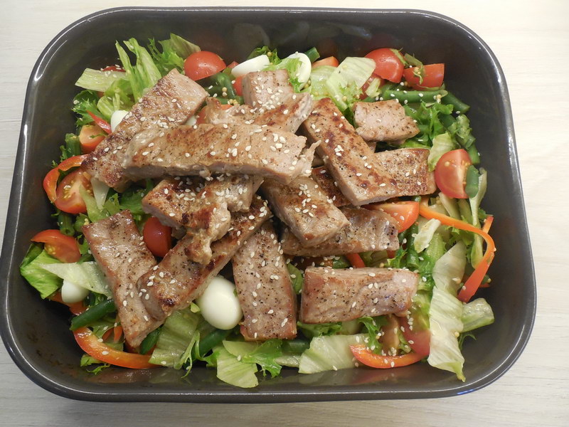 В блюдо поверх овощей устраиваем румяного тунца. Перед подачей посыпаем белым кунжутом. Салат «Нисуаз» готов. Пробуйте и наслаждайтесь.