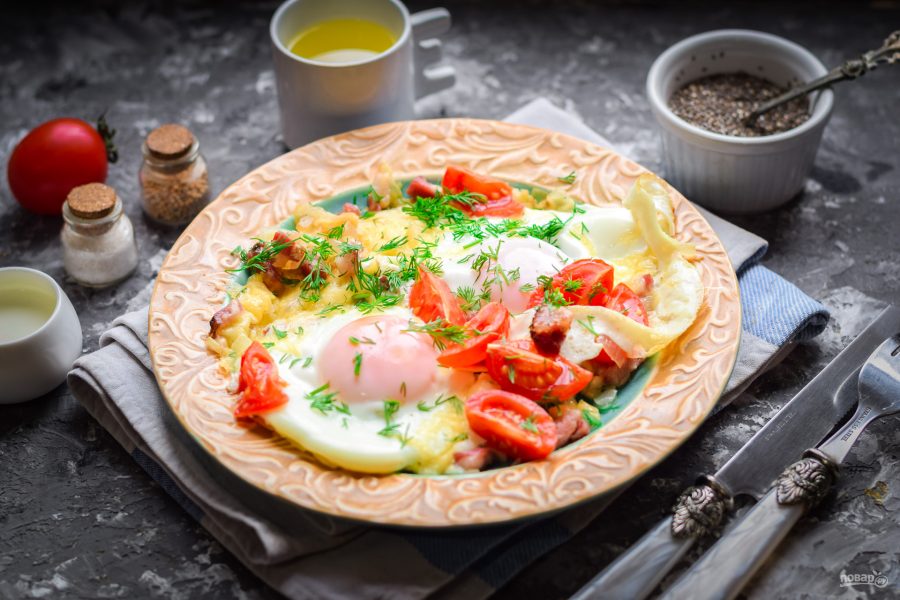 На все приготовление царской яичницы уйдет максимум 10-15 минут. Подайте ее на стол со свежим белым хлебом и овощами.