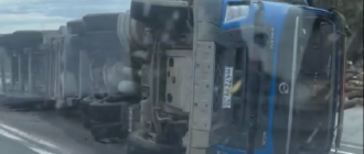 Очевидцы запечатлели перевернутый грузовик и разбросанные бревна Груженый бревнами лесовоз попал в аварию на