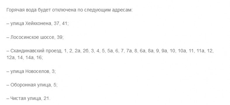 24-25 сентября от горячей воды будут отключены около трех десятков зданий на улицах Хейкконена, Новоселов, Оборонной, Чистой, в Скандинавском проезде, на Лососинском шоссе.