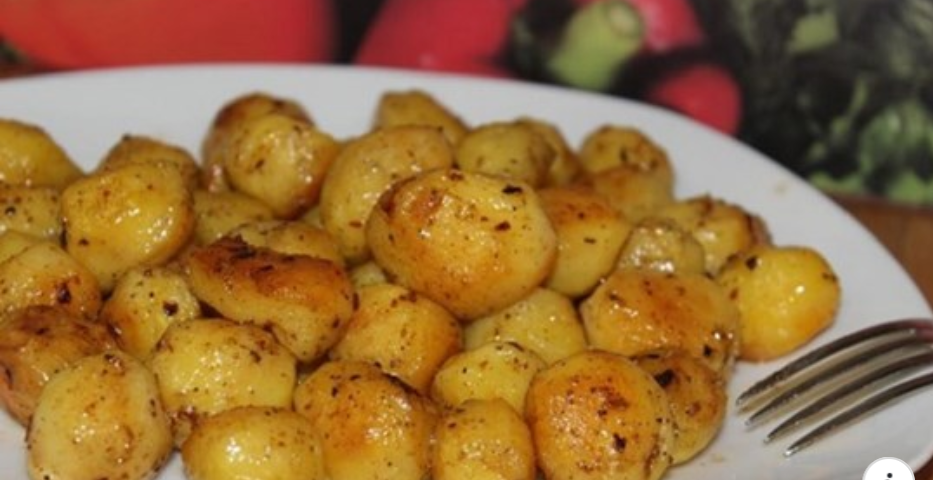 - Слей воду из кастрюли, дай картофелю немного остыть и залей заправкой. Накрой кастрюлю крышкой и встряхни, чтобы заправка равномерно распределилась. Теперь выложи кусочки картофеля на смазанный маслом противень и запекай 15–20 минут при температуре 200 градусов. Золотистая корочка подскажет, что блюдо готово. Измельчи зелень, посыпь картофель — и можно подавать на стол!