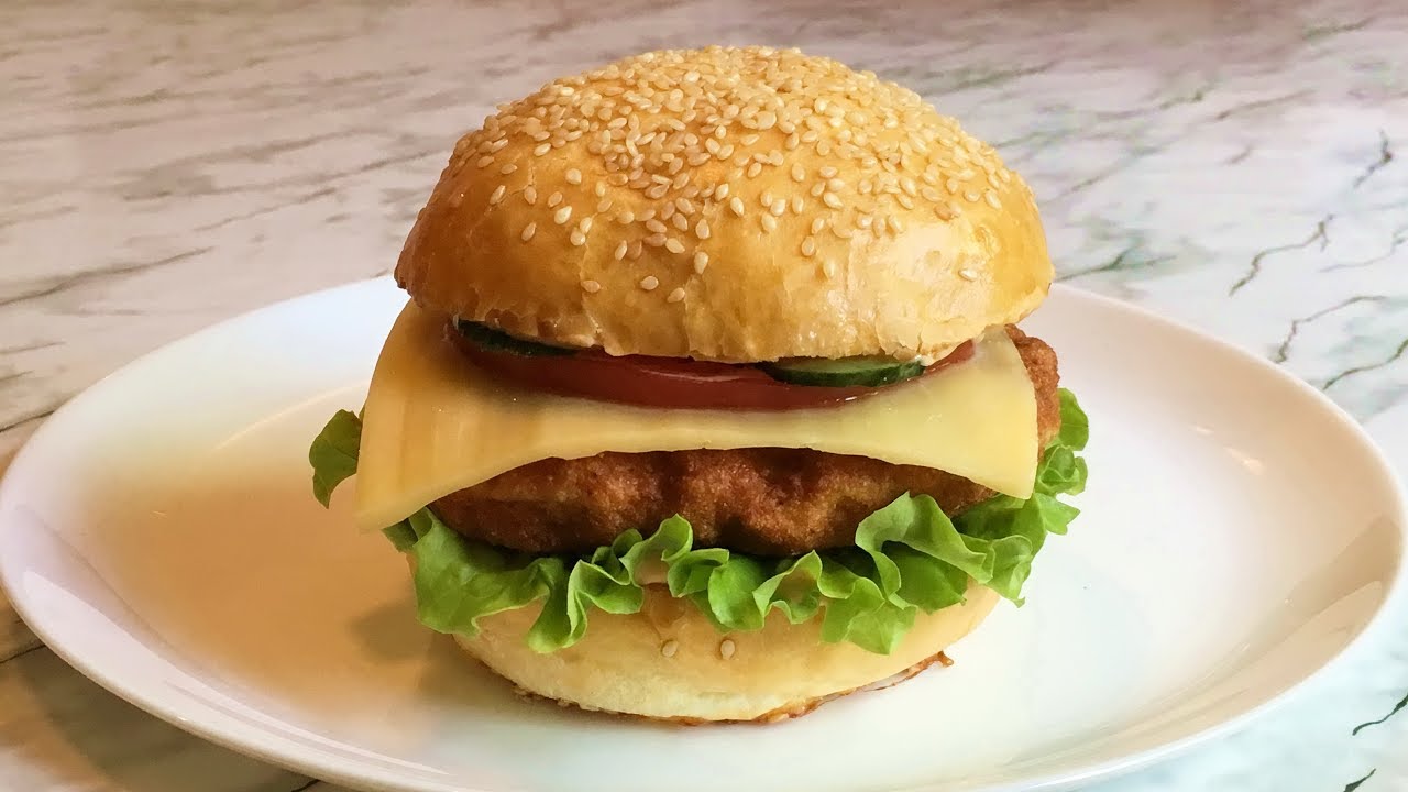 - Соберите а-ля чикенбургер по Дюкану: на низ булочки выложите лист латука, тонкие кольца лука, ломтик или колечки огурца. Затем можно дополнительно слой горчицы и на него котлету из курицы. Сверху помидор, снова лист латука и верх булочки.