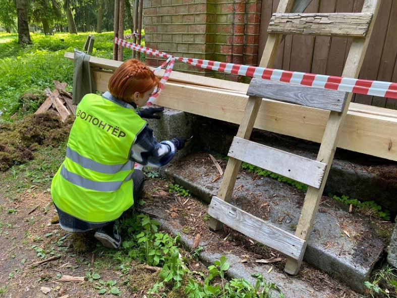 Вокруг него уже поставили строительные леса и консервационную крышу. К специалистам присоединились волонтеры. Они разобрали строительный мусор, очистили от растений и мха гранитный цоколь. // фото: администрация Сортавальского района/ВКонтакте