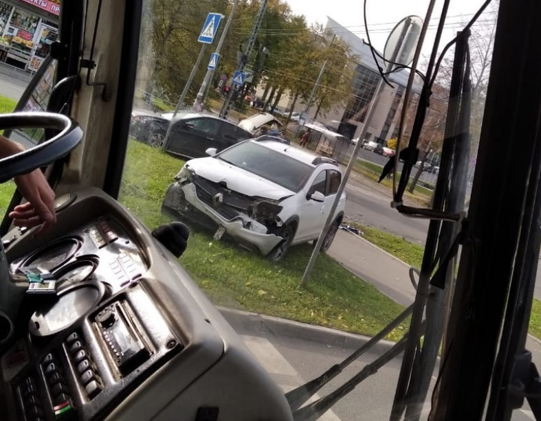 Одна из машин вылетела на газон, другая остановилась на пешеходном переходе