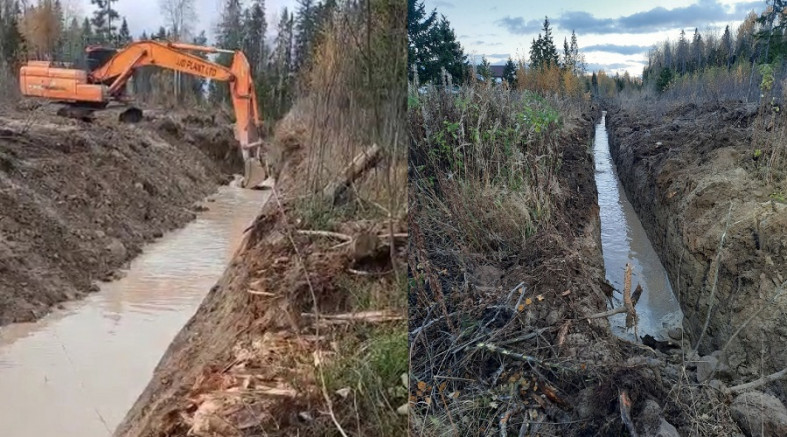 Уже выкопали в общей сложности около 400 метров. Благодаря этому грунтовые воды отведут от жилых домов и дороги. // Фото: Владимир Любарский/ВКонтакте