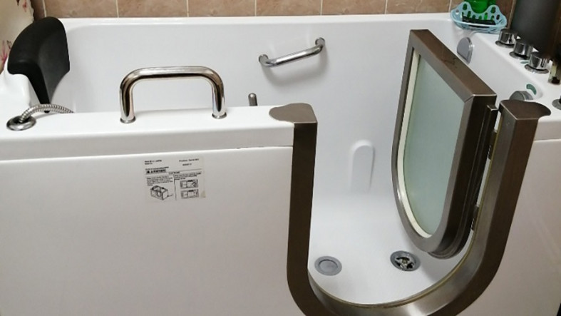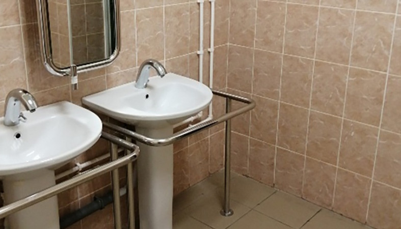 Заменили плитку на полу на противоскользящую, поставили поручни и держатели для костылей, сделали шире дверные проемы, нанесли на них контрастную ленту.