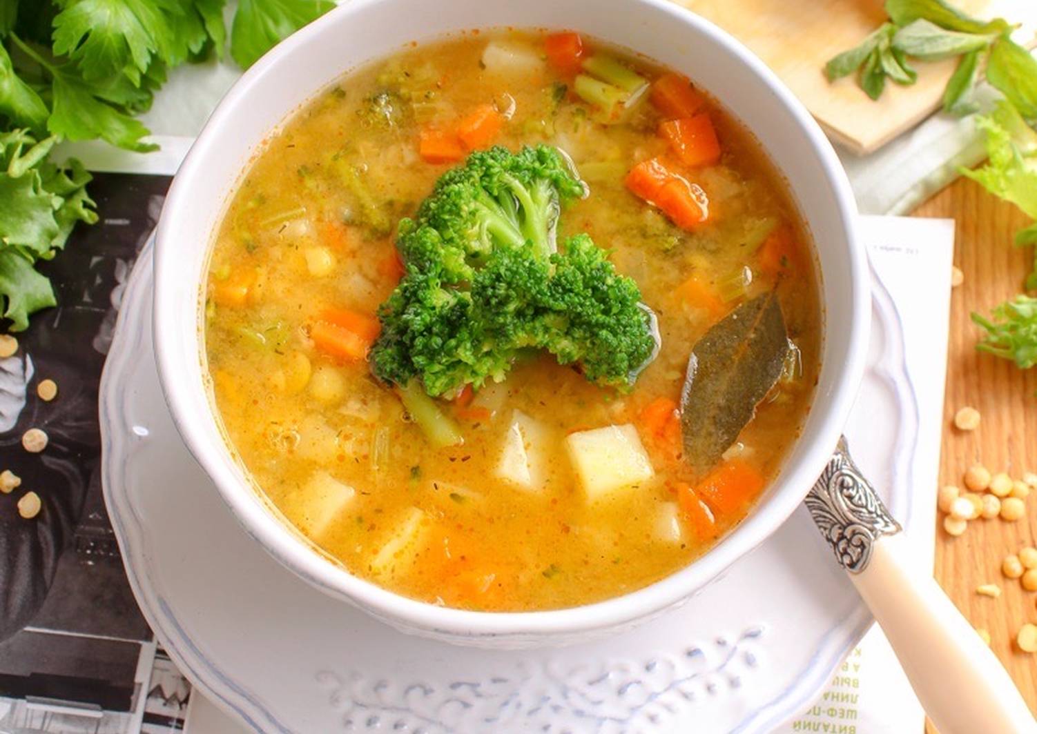 Главное, налить достаточно много воды — горох сильно разбухает в процессе варки, если воды будет недостаточно, получится не суп, а каша.