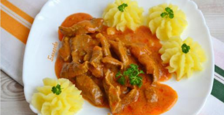 Это вкуснейшее мясное блюдо в нежном сметанно-томатном соусе. Надо сказать, что бефстроганов — это классическое блюдо русской кухни. Говядина по-строгановски готовится очень просто, а блюдо получается необыкновенно вкусным.