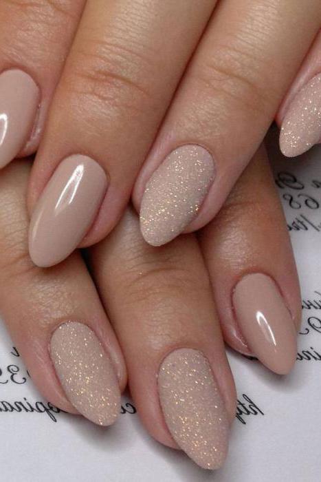 Чтобы обычное нюдовое покрытие не казалось скучным, его украшают блесками и стразами. На ярких оттенках они выглядят вычурно, а беж — только украшают. Нюдовая гамма приглушает яркое сияние блестков. Прекрасным дополнением послужит специальная пудра для ногтей. Такой маникюр выглядит роскошно и богато. Можно оформить камнями только один ноготь или наклеить на каждом по одному большому стразику, которые напомнят капельки росы.