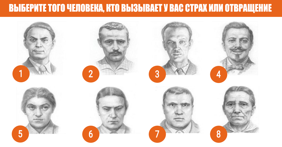 Этот тест разработан психиатром Леопольдом Сонди. По мнению специалиста, с помощью притягательности лица, можно узнать о некоторых особенностях характера человека. Все, что вам нужно сделать, это посмотреть на изображения, а потом выбрать картинку с тем человеком, который вызывает у вас отвращение, а может даже и страх.