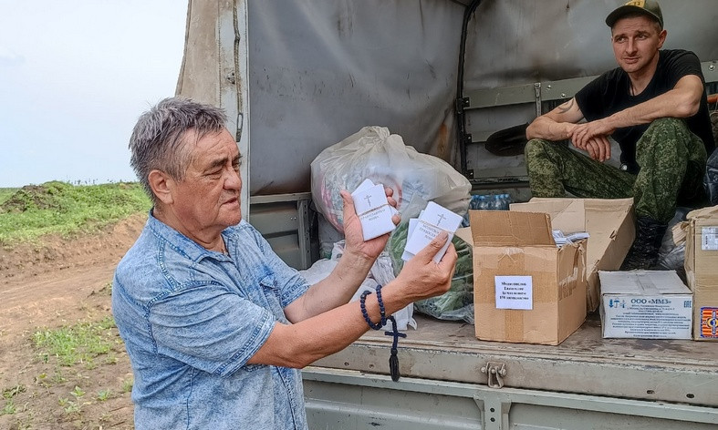 Артисты из Святозера передали гуманитарную помощь: медицинские препараты, продукты питания, вручили воинам флаги РФ, молитвословы и стяг Христа Спасителя. Детям к Дню защиты детей подарили подарки. //фото Александра Пшенникова