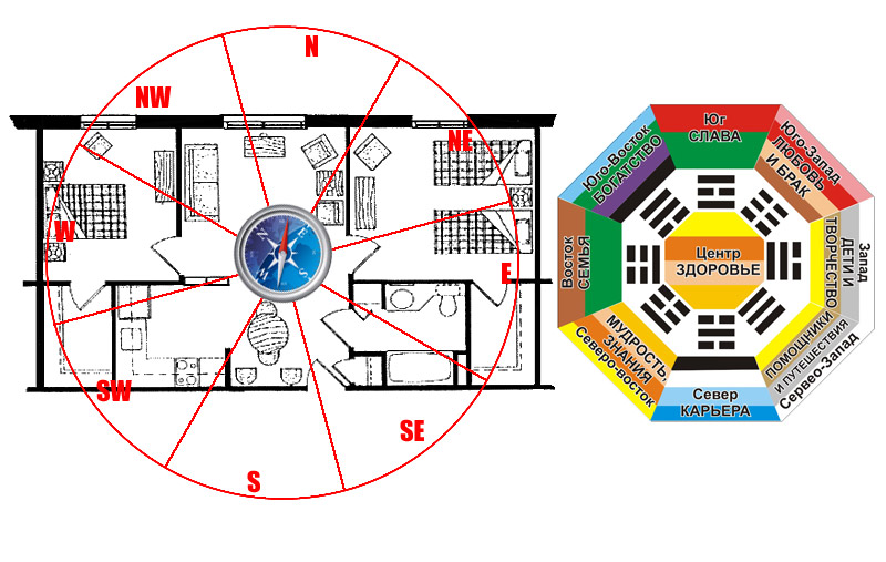 Расположение зон фэн-шуй в квартире определяют с помощью зеркала Багуа – карты или схемы в виде восьмиугольника, разделенного на 8 секторов по числу основных и промежуточных сторон света: север, запад, юг, восток, северо-запад, северо-восток, юго-запад, юго-восток. Каждому сектору соответствует определенная сфера жизни: