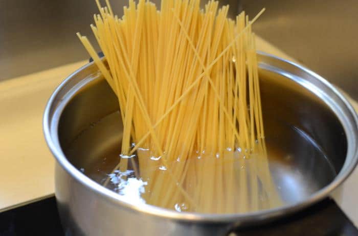 Спагетти не нужно ломать и лучше поставить их в кастрюлю, чтобы получился веер. Спустя время их нужно опустить, чтобы они полностью утонули в воде. Как только макароны полностью погрузились, нужно добавить одну столовую ложку оливкового масла.
