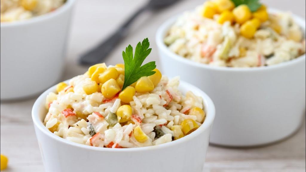 Крабовый салат с кукурузой пользуется большой популярностью. Делать его довольно просто. Так как в его состав входит рис, то отварите его заранее, чтобы перед началом работы он остыл. Рассмотрим внимательнее, какие ингредиенты входят в его состав: