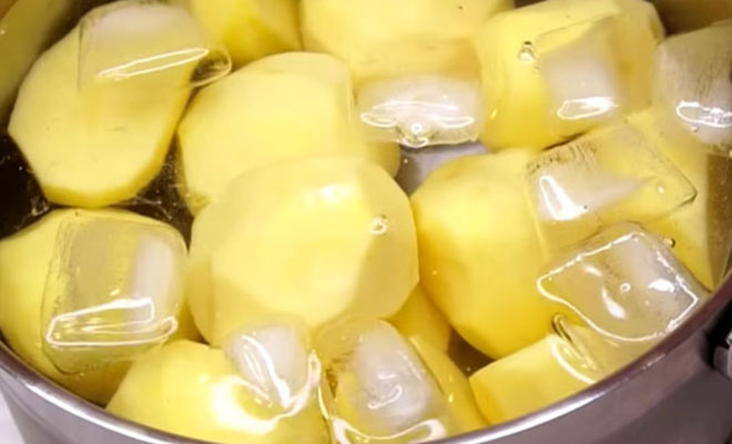 Секрет хрустящей корочки заключается в том, чтобы картошка гарантированно образовала хрустящую корочку. Это получится, если клубни на 5-7 минут погрузить в ледяную воду со льдом, в которой будет ложка соли.