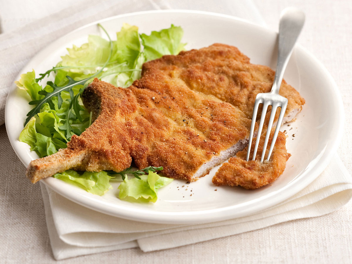 После муки отбитую корейку кладем в льезон и в панировочные сухари.