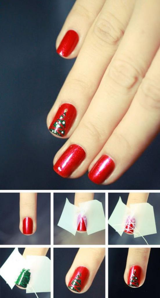 А теперь необходимо на один из ногтей нанести рисунок. Для этого следует из двух кусочков скотча сложить треугольник. Как это сделать, можно посмотреть на картинке. Теперь тонкими полосками скотча выкладываем секторы елки. Затем необходимо покрыть весь треугольник зеленым лаком. Просушиваем ноготь и отдираем скотч. Красно-зеленый маникюр почти готов. Осталось нанести топовое покрытие и просушить его. Всю эту процедуру нужно повторить на другой руке.