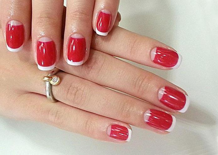 Дополнить оформление можно окантовкой границ цветового перехода более тёмными оттенками, например, отлично будет смотреться классическое сочетание белого, красного и чёрного. Ногтевая пластина может быть покрыта алой палитрой, а улыбка – белой. Тонкие чёрные полосы на границе основных цветов сделают оформление более пафосным. А если заменить тёмный цвет на камушки, тогда выйдет сногсшибательный красный маникюр со стразами.
