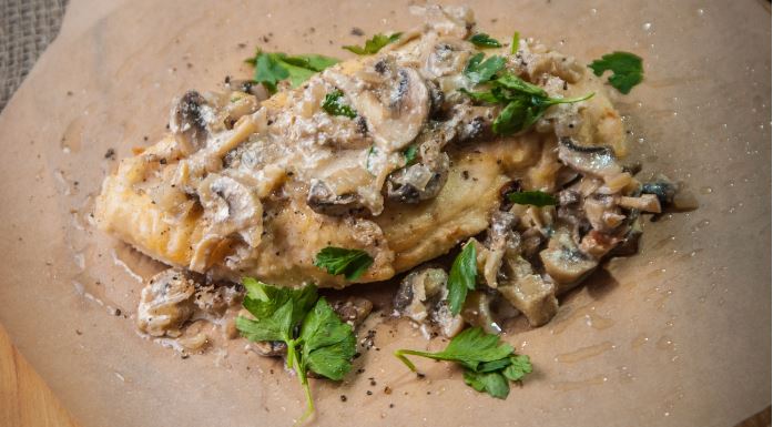 — Круг смазать маслом, выложить в центр каждого круга по одному филе, добавить по пару ложек соуса, присыпать петрушкой. Накрыть вторым кругом бумаги и закрепить края.