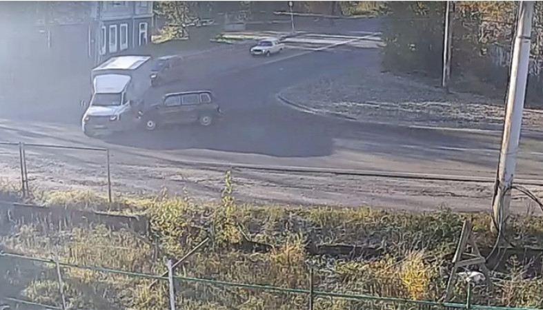 На повороте врезались друг в друга легковой автомобиль и фургон, этот момент попал в кадр камеры уличного наблюдения «Сампо.ру».
