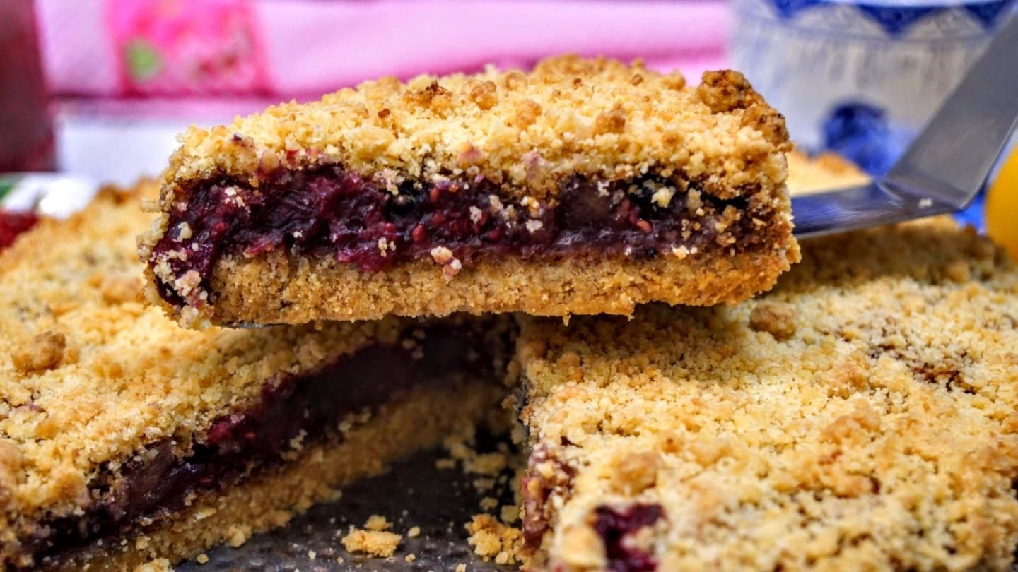И присыпать оставшейся крошкой теста, сверху я не придавливаю.