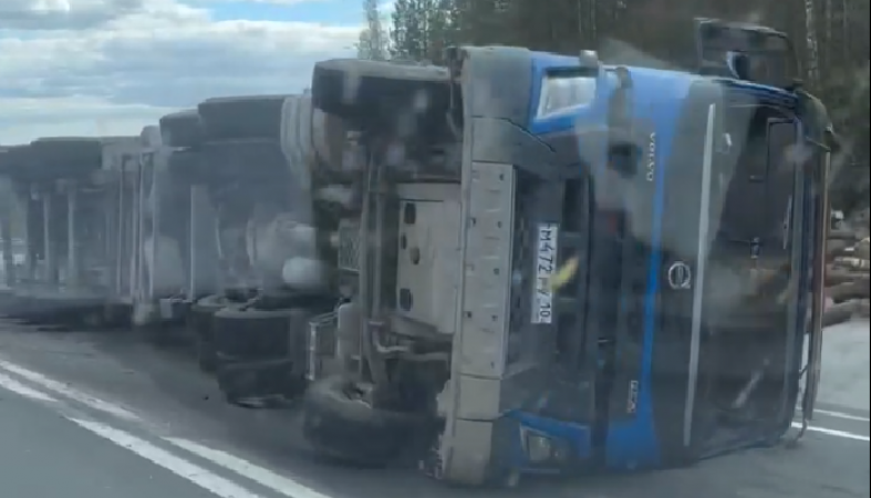 Проезжавшие мимо водители запечатлели на свои видеорегистраторы огромную перевернутую машину. В кадре видно, что бревна раскатились по проезжей части.