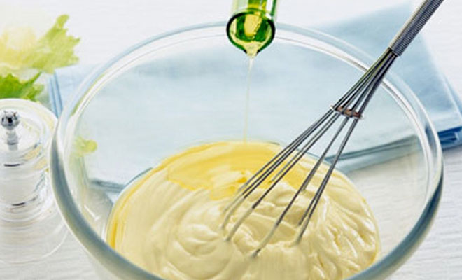 Когда масла больше чем нужно и добавляется оно слишком быстро, возникают сложности при эмульгировании. В результате на выходе вместо однородной массы мы получаем распадающуюся эмульсию без характерного вкуса. Добавлять масло следует постепенно небольшими порциями, начав с одной-двух чайных ложек. После добавления некоторого количества масла смесь тщательно эмульгируется до однородной массы, после чего доливается очередная порция масла. Процесс повторяется несколько раз, пока структура майонеза не станет желеобразной.