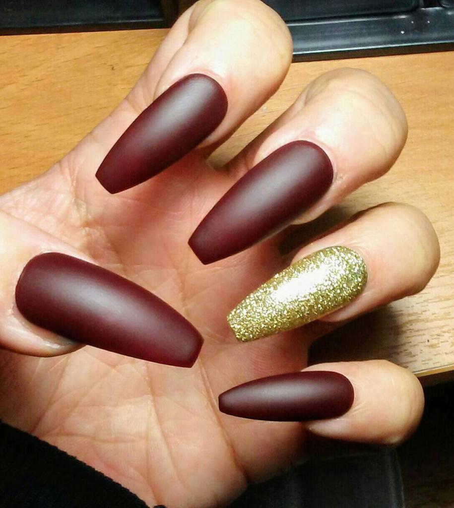 Преобразить бордовые ноготки можно и золотистым глиттером. Это специальные блестящие частички из фольги разных форм и размеров. На ноготках он напоминает рыбью чешую, слюду или стекло. Глиттер бывает жидкий и рассыпчатый. Второй наносится просто на еще не высохший лак. Особой популярностью пользуется глиттер-пудра золотистого цвета.