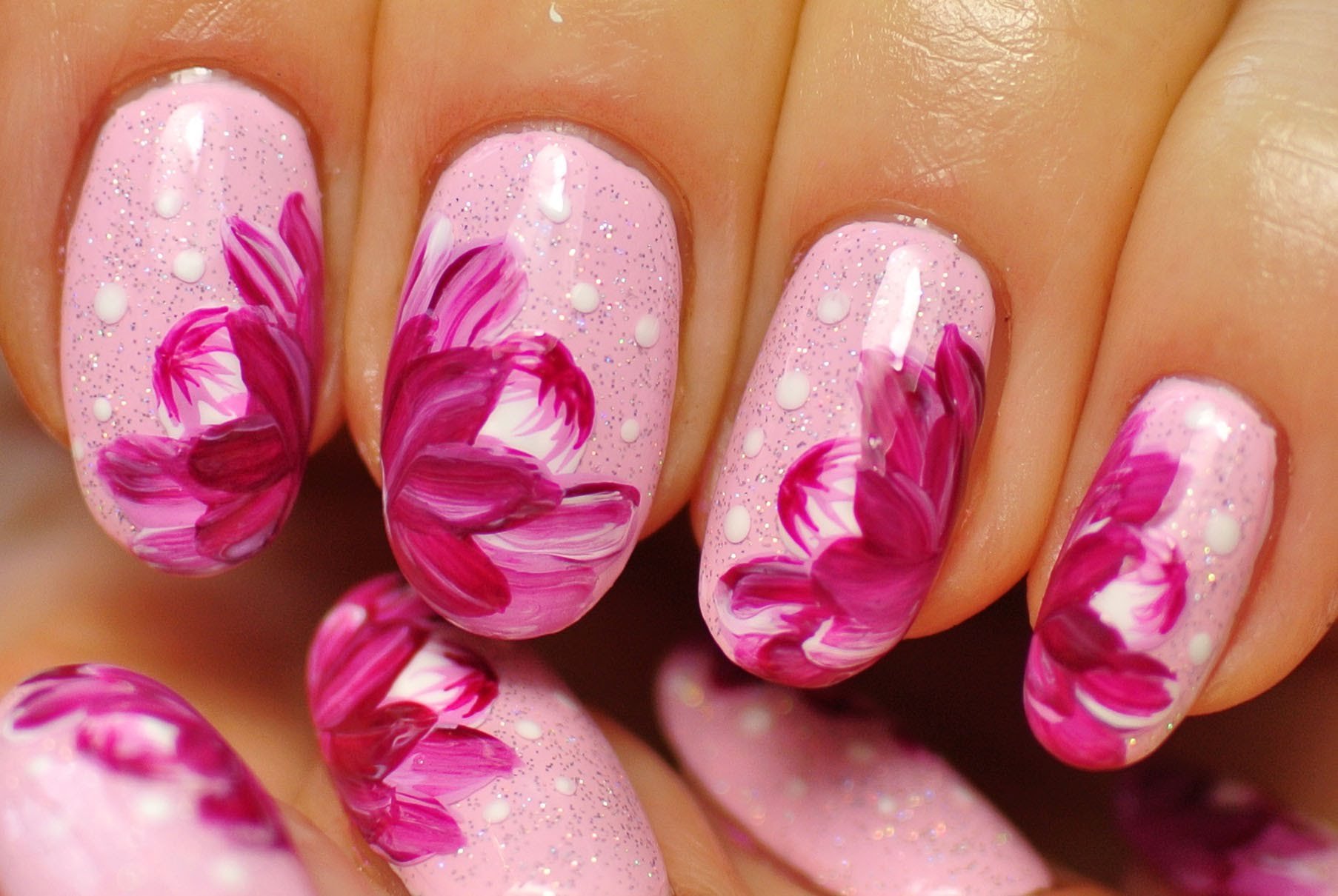 Если у женщины длинные ногти, то ей стоит отдать предпочтение нежному и женственному маникюру с розами и серебряными блестками.