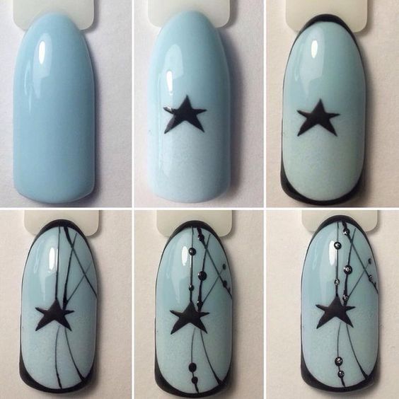 Украсить звездами можно, к примеру, новогодний маникюр. Но такой дизайн будет вполне уместен и на любых других торжествах. В зависимости от сезона можно подобрать цветовую гамму. Для холодной зимы с ее новогодней суетой, узорчатыми окнами и белыми вьюгами отлично подойдут такие сочетания: