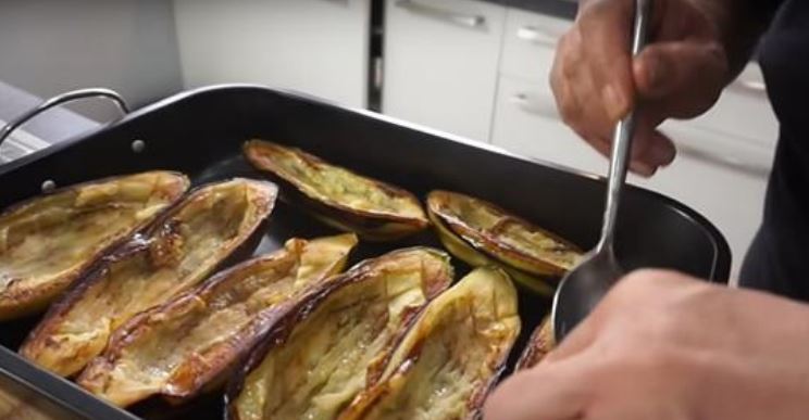 - Когда баклажаны немного остынут, вынь из них серединку. Баклажаны выкладывай на противень, а мякоть из середины обжарь на сковороде. Не нужно добавлять масло, мякоть уже достаточно жирная.