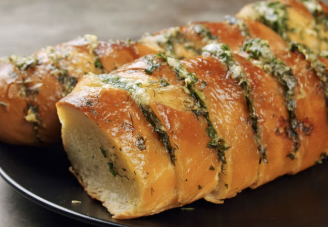 Самое простое оставили напоследок. Это багет с зеленью, сыром и чесноком. Масло смешивается с остальными ингредиентами, а багет надрезается вдоль всей длины через каждые 2 сантиметра.
