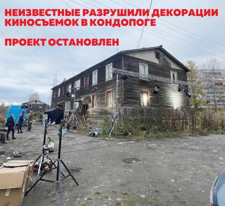 Несколько дней в городе бумажников работала киносъемочная группа федерального канала. Но ночью 13 октября неизвестные разрушили декорации в Кондопоге. Съемки отменили, а проект в городе остановили. Об этом сообщили в официальном паблике администрации района.
