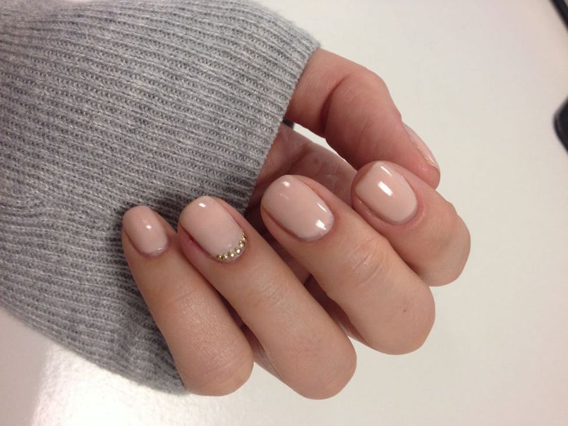 Даже на коротких ноготках квадратной формы с закругленными краями смотрится нюдовый лак женственно. Добавить уникальности такому маникюру можно размещением на одном выбранном ногте мелких заклепок. Их фиксируют либо специальным косметическим клеем, либо на слой лака. А после высушивания для надежности дополнительно покрывают мелкие элементы закрепителем.