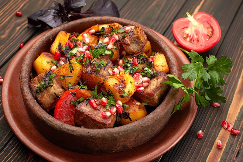 Разложите мясо с картофелем по тарелкам, украсьте листочками базилика и подавайте.