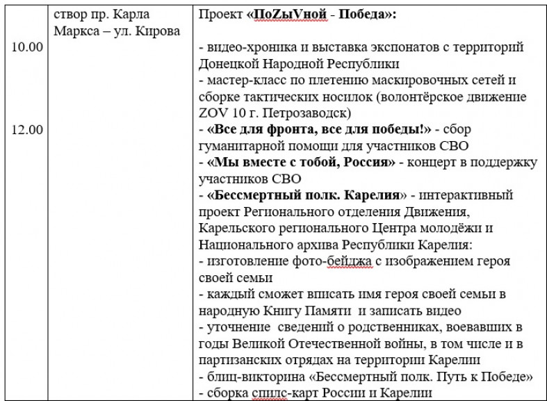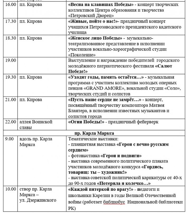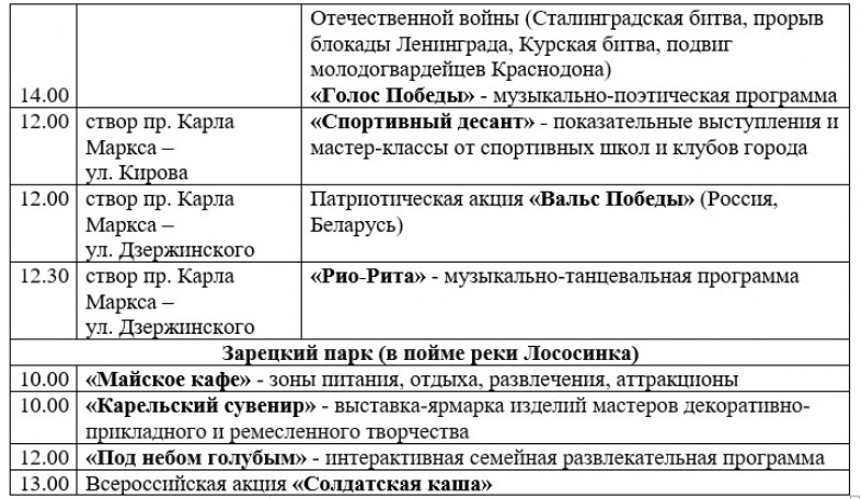 Основные события праздника пройдут на площади Кирова. Там на больших экранах будут транслировать Парад Победы в Москве, а в 11 часов состоится торжественный марш воинов Петрозаводского гарнизона и силовых структур.