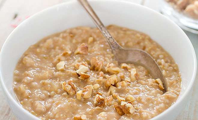 Принято считать, что овсянка – блюдо моментальной готовности. Это так, если речь идет о хлопьях быстрого приготовления, в которых практически не осталось полезных веществ и нужной клетчатки. Если же вы готовите настоящие овсяные хлопья, не следует торопиться. Им нужно достаточно времени, чтобы вобрать в себя жидкость и приобрести мягкую сливочную текстуру. К тому же, если достаточно хорошо и долго мешать овсянку, лишний крахмал высвободится и каша станет более нежной и менее липкой.