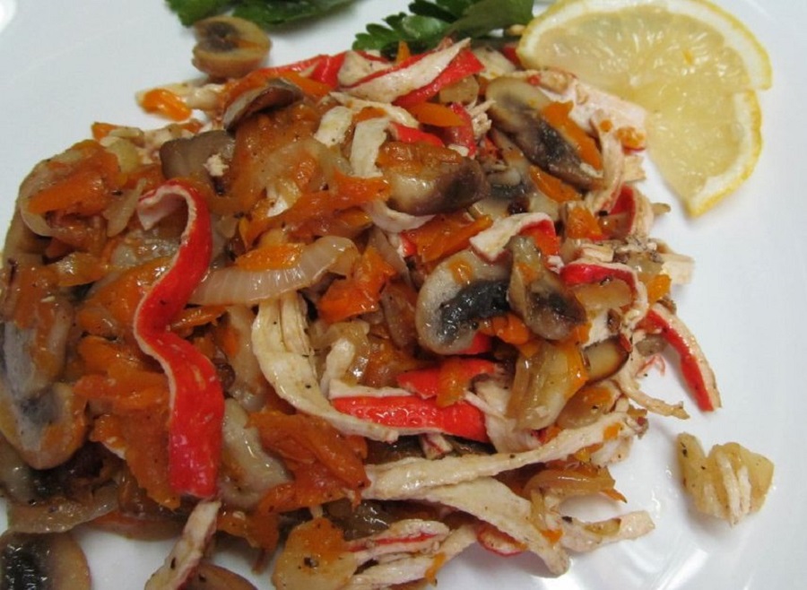 Так, я открыла для себя новый салат из жаренных крабовых палочек. Если бы мне не сказали, я бы и не догадалась, так как по форме они напоминали больше лапшу, но с крабовым вкусом ( о составе говорить не буду, так как понимаем, что оригинальных палочек нам, среднестатистической семье не найти).