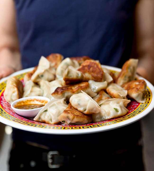 - Смешайте кунжутное масло (2 ч. л.), соевый соус (2 ч. л.) и рисовый уксус (1 ч. л.). Выложите на тарелку 3–5 пельменей, обжаренной стороной кверху, полейте соусом и подавайте к столу.