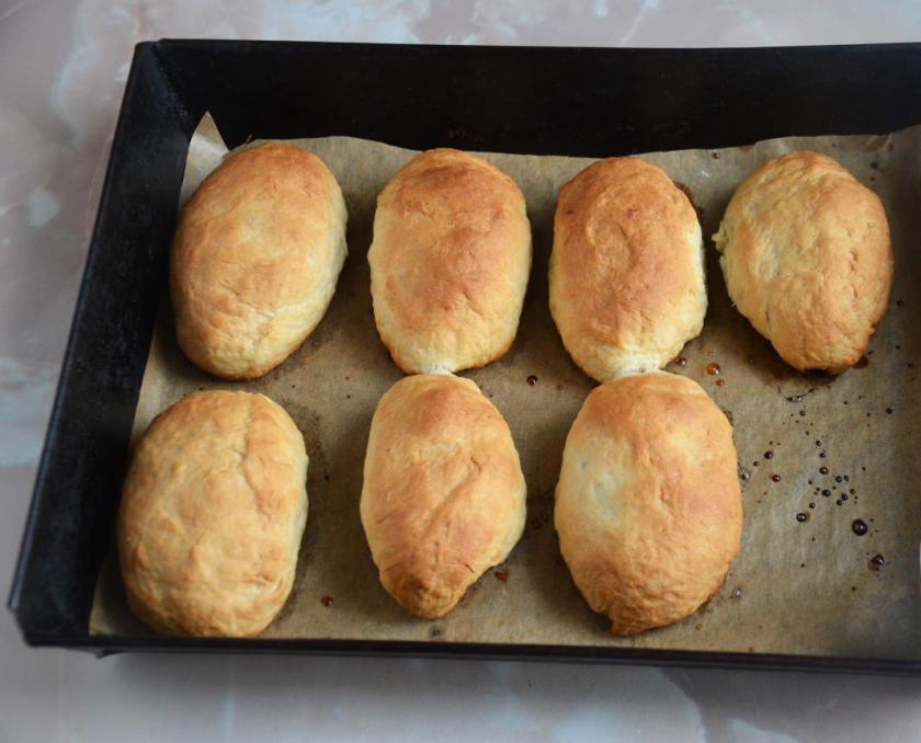 Разогреваем духовой шкаф до значения 180 градусов. Помещаем внутрь будущие пирожки. Как только изделия зарумянятся, вынимаем их и очень аккуратно снимаем с поверхности противня.