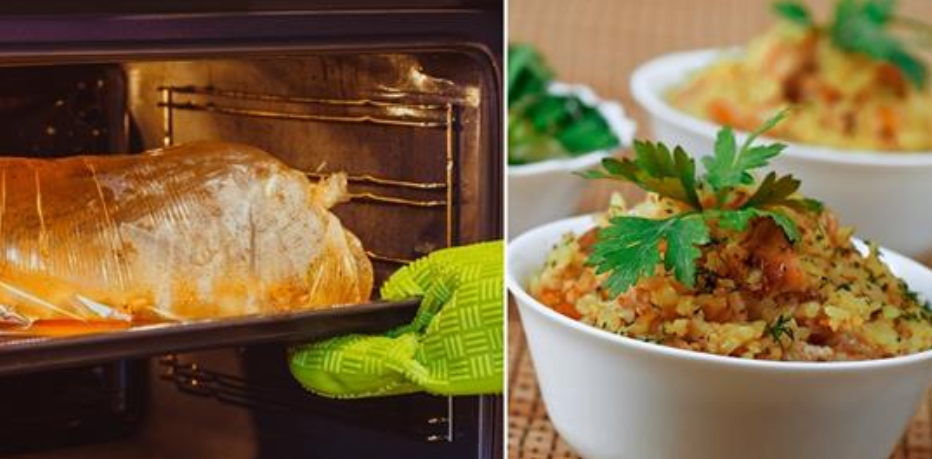 - Разогрей духовку до 190 градусов и поставь в нее плов, предварительно завязав рукав. Запекай при этой температуре в течение часа.