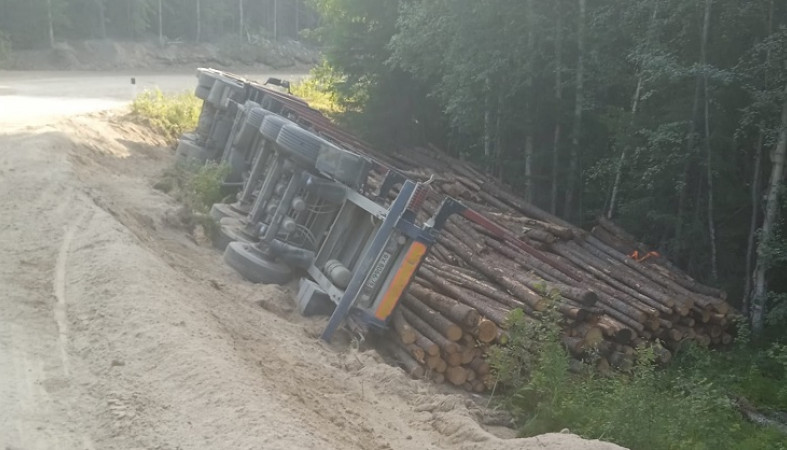 На 22-м километре автодороги опрокинулся лесовоз Scania с прицепом. Почему это произошло, предстоит выяснить.