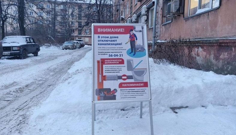 В начале декабря ООО «КРЦ» стало оповещать должников об отключении услуг новым способом: устанавливать баннеры с предупреждением у подъездов, где живут неплательщики.