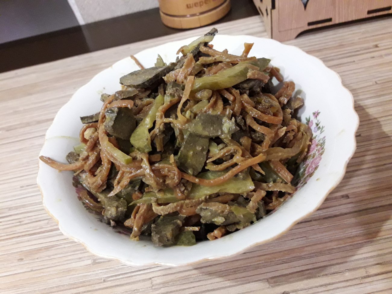 Получается необычный, недорогой, очень вкусный и сытный салат…