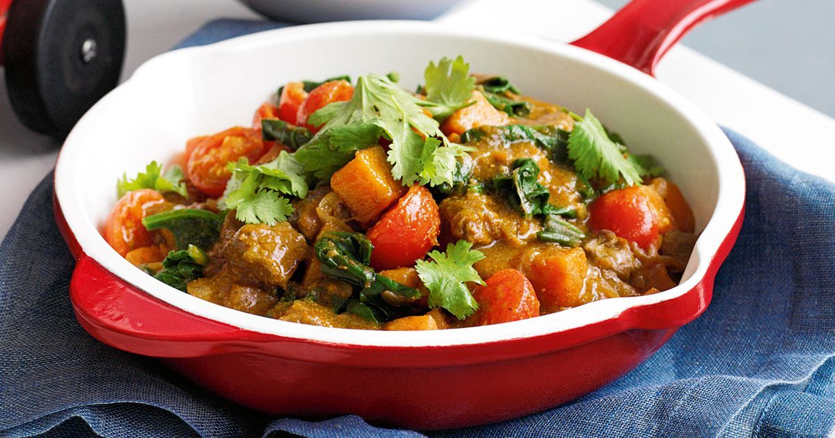 - В сковороду долейте немного масла, положите лук, обжаривайте 5 мин. Верните в сковороду мясо, приправьте карри, перемешайте.